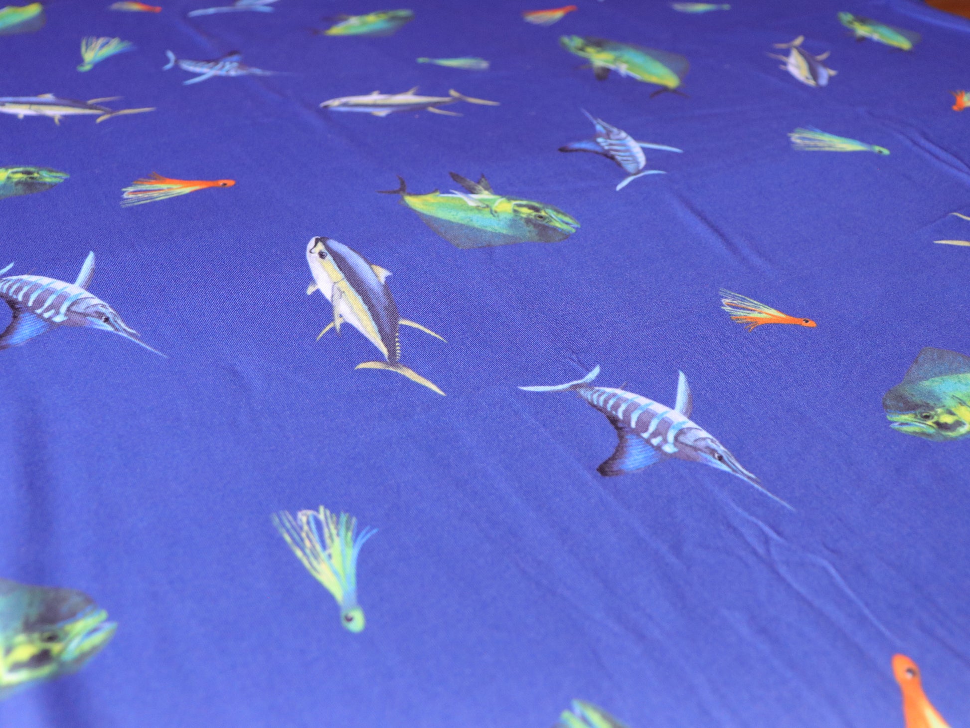 This fitted sheet features a new digitally drawn design of popular big game fish Marlin, Mahimahi, Yellowfin Tuna and Lures in a Deep Sea Blue colour and comes in a matching drawstring bag.