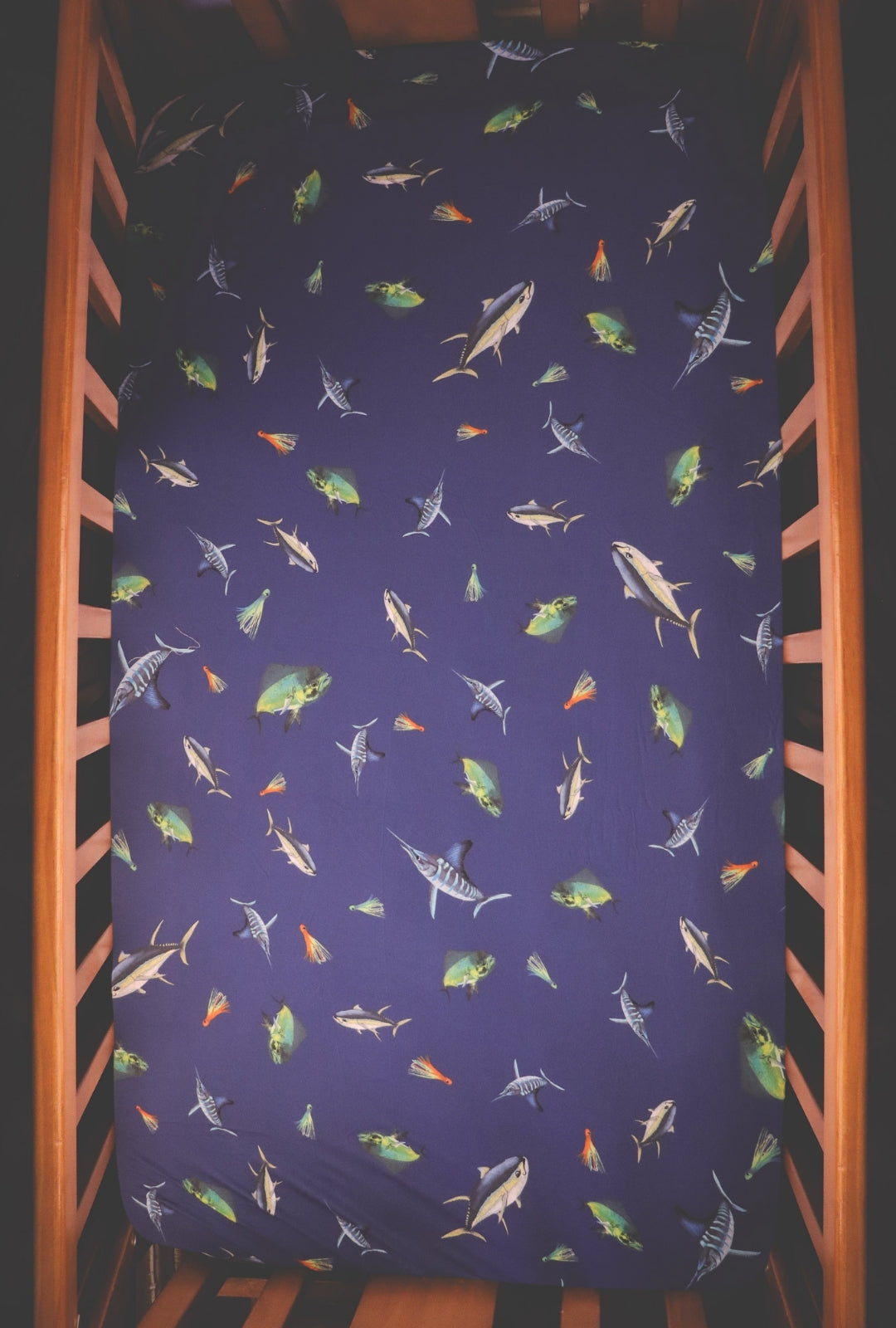 Big Game Fishing - Bamboo Fitted Cot Sheet - Deep Blue