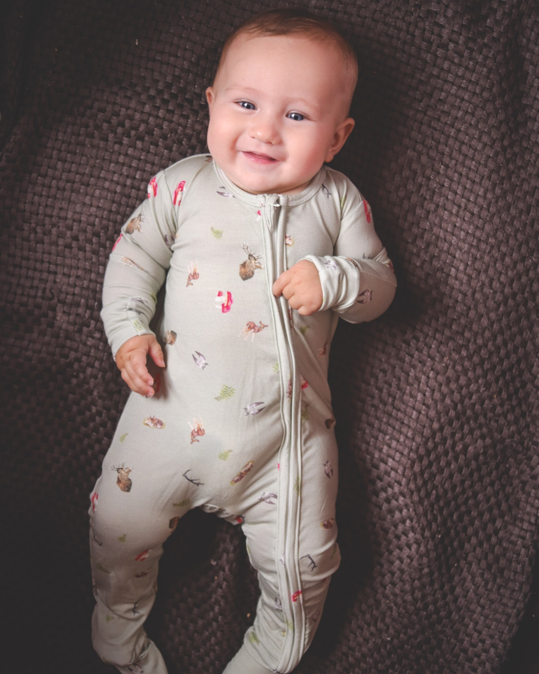 Our adorable onesies are buttery soft and super stretchy adorned in hand drawn Deer and Forest themed items on a lovely sage.