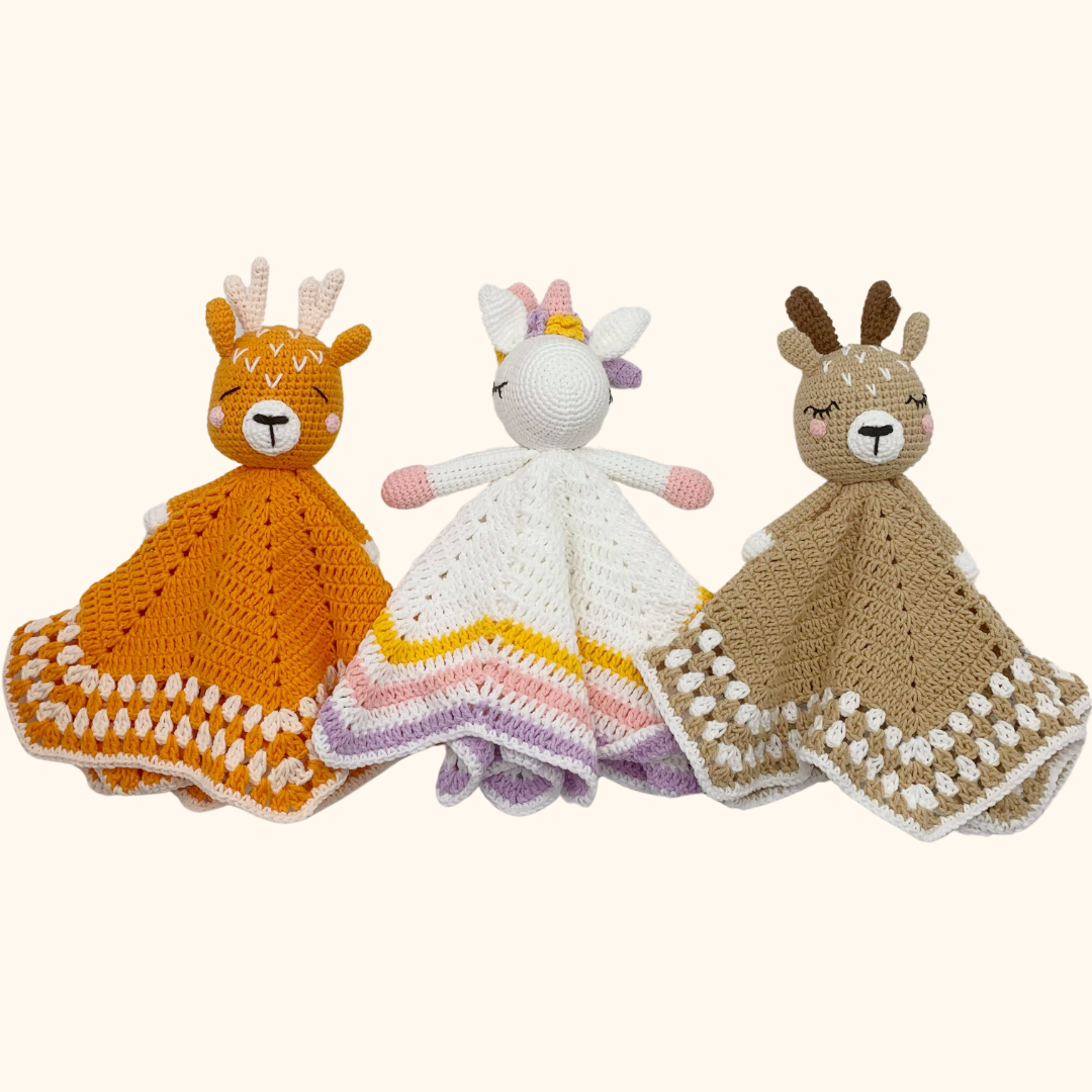 Crochet Snuggly, a cute gift for baby, comes in Unicorn, brown deer and orange deer.