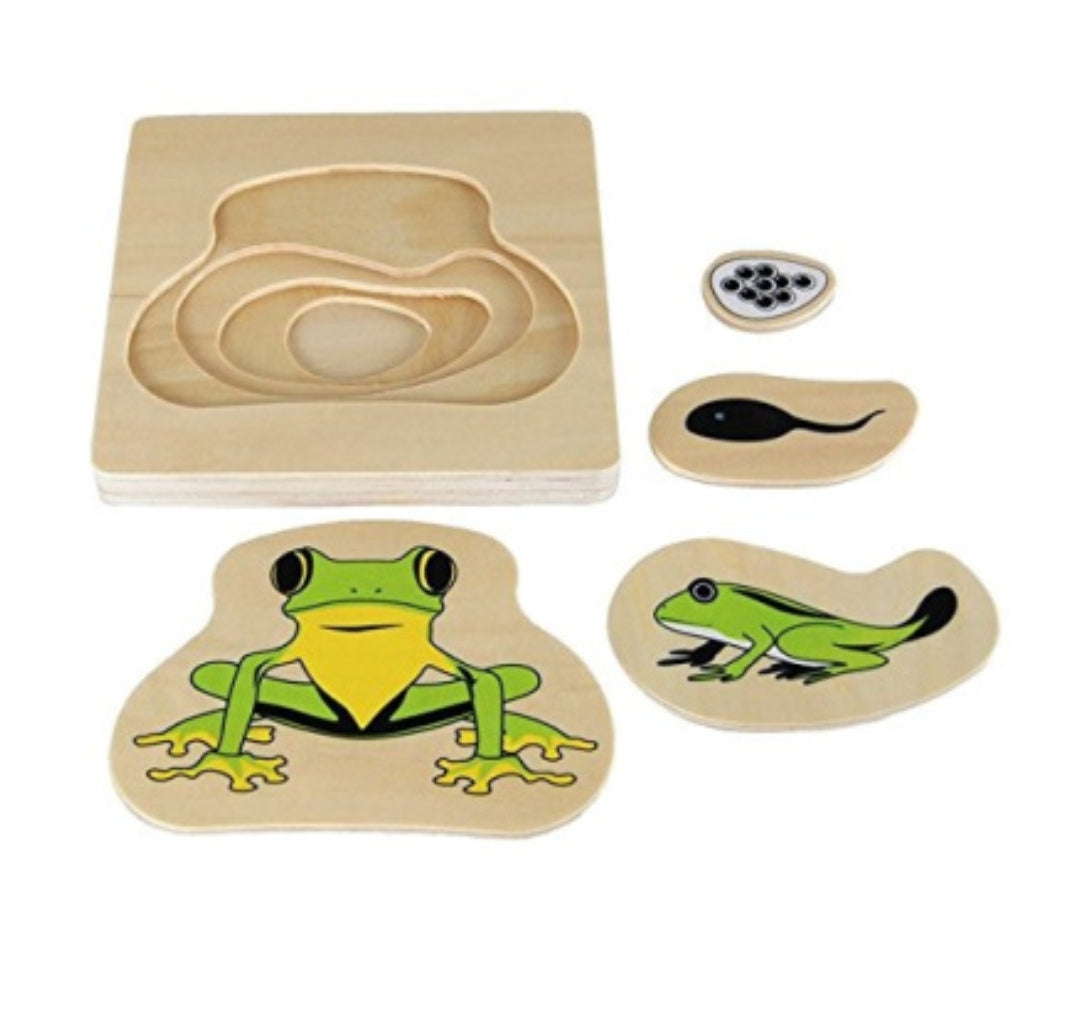 A simple shape to fit puzzle showing the life stages from Egg to adult Frog in a creative way. Great for hand-eye coordination.