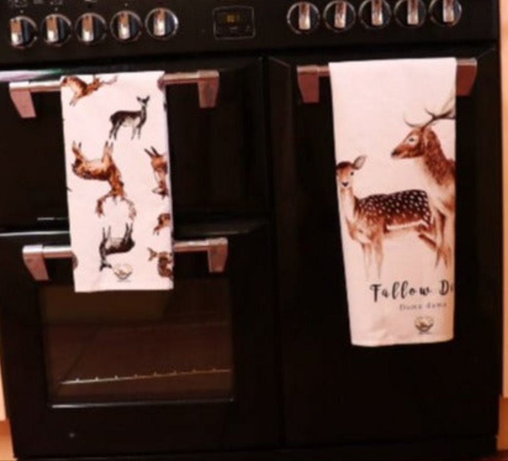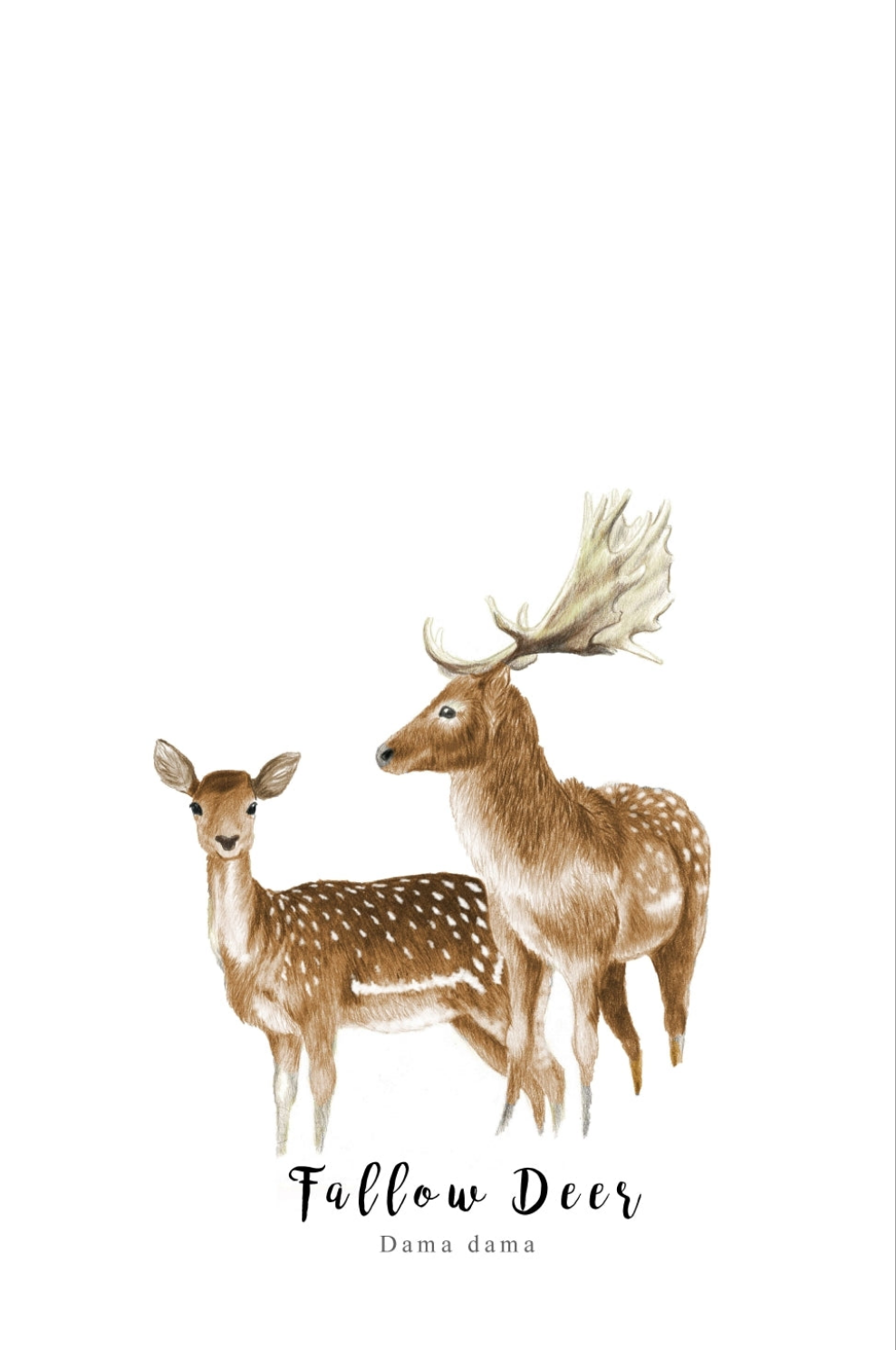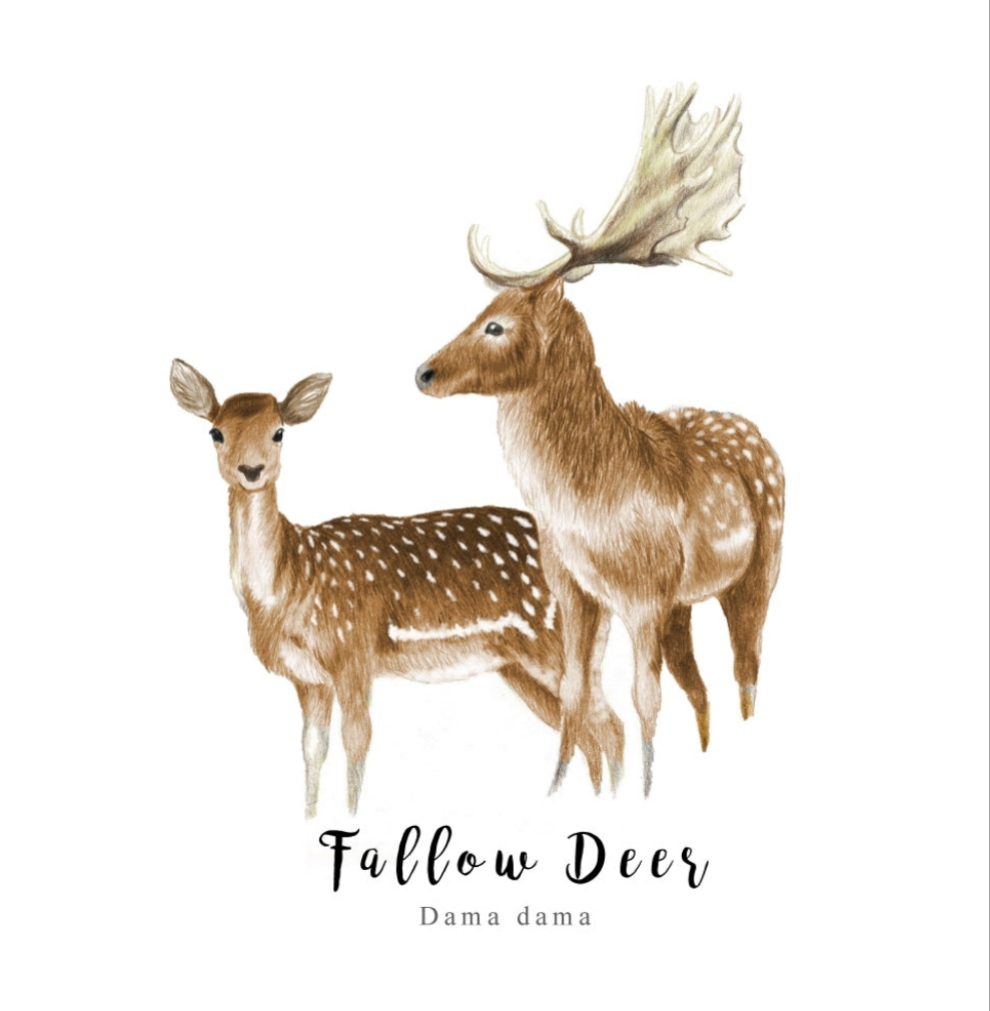 Featuring the name and scientific name of the popular Fallow Deer along with a delicately hand drawn hind and buck.