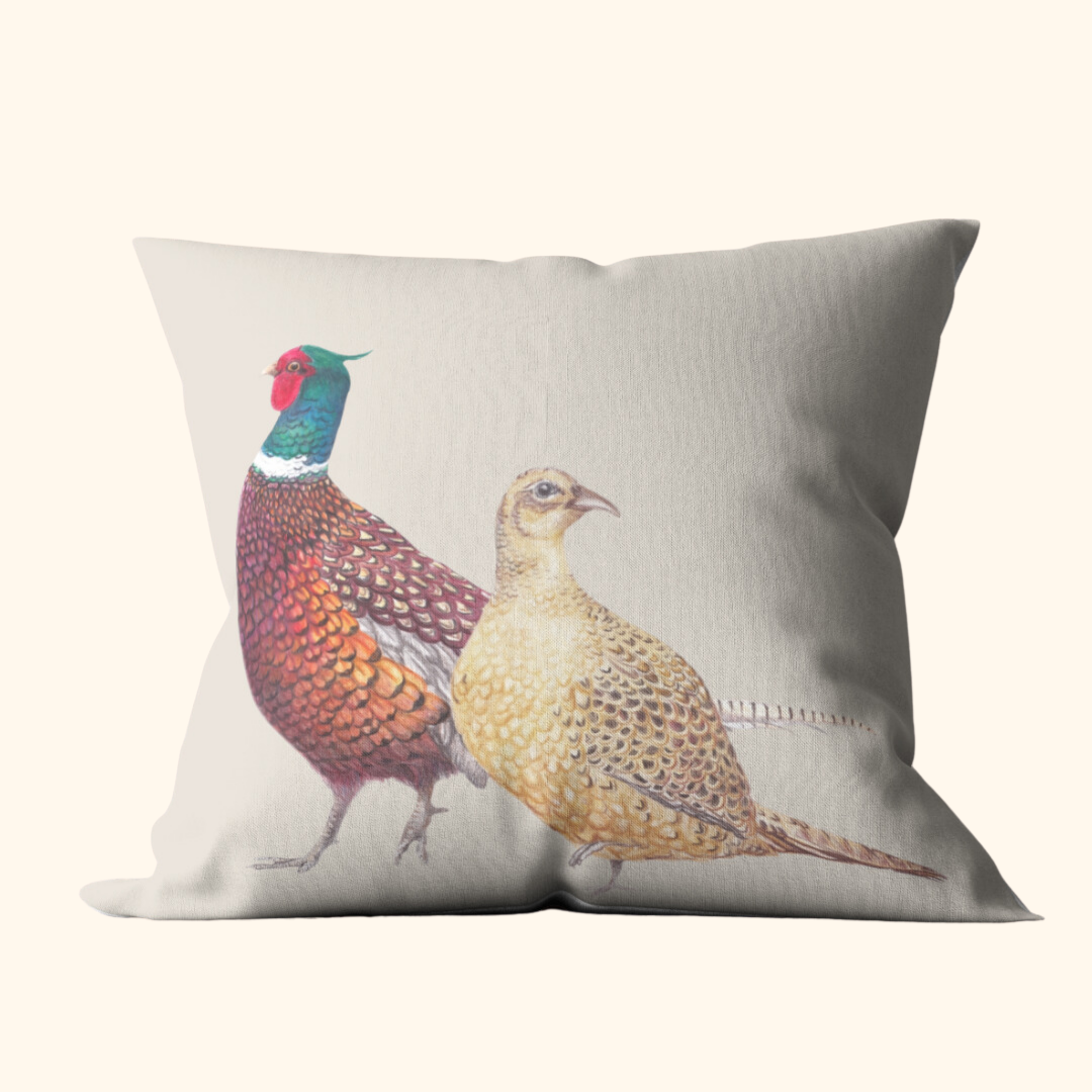 The Pheasant Pair cushion cover features a brightly coloured hand drawn pair of Ringnecked Pheasants which would look regal in any home.