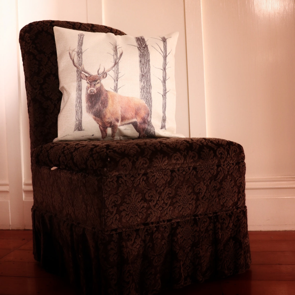 This Red Stag cushion cover features a lone stag standing amongst the pines.
