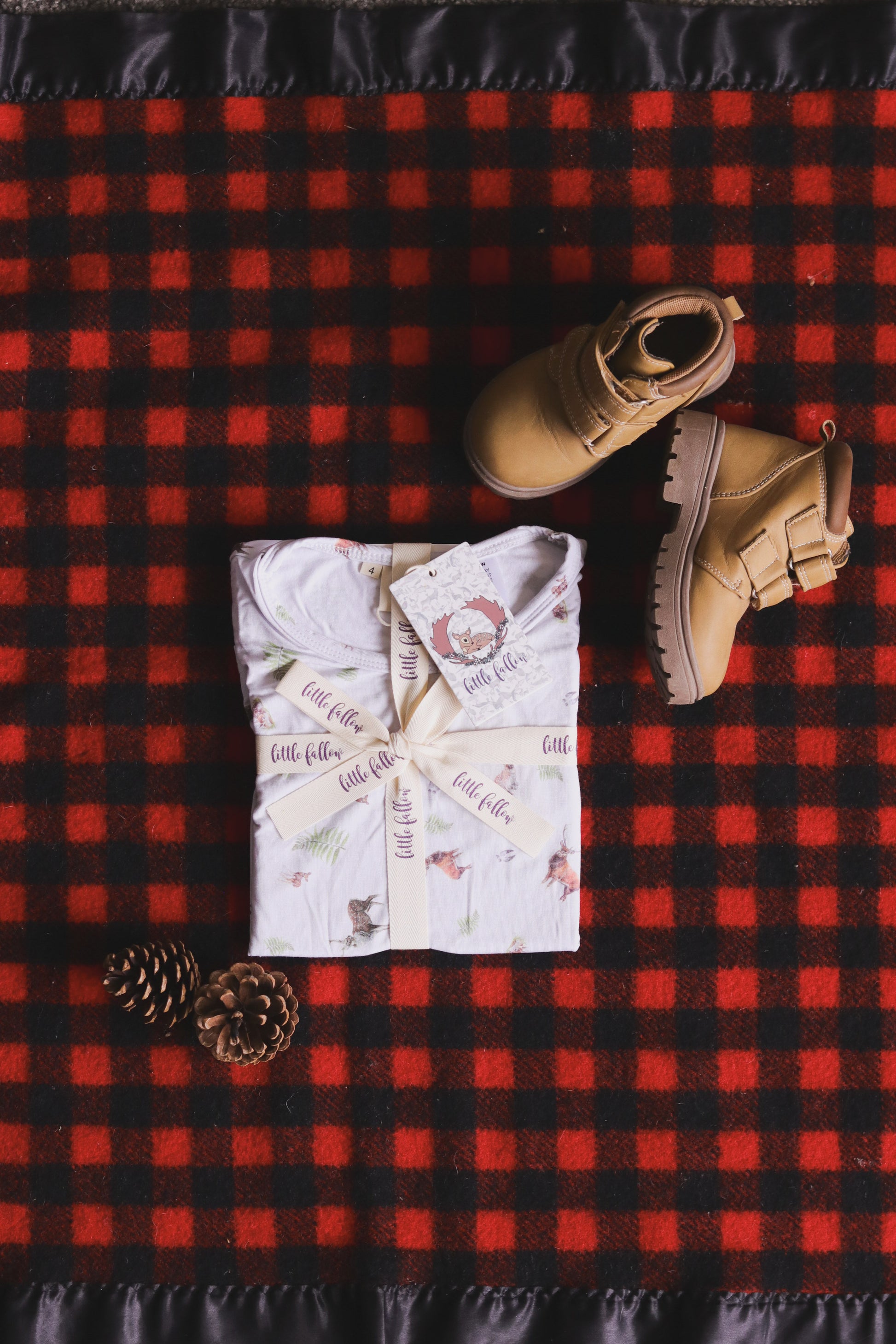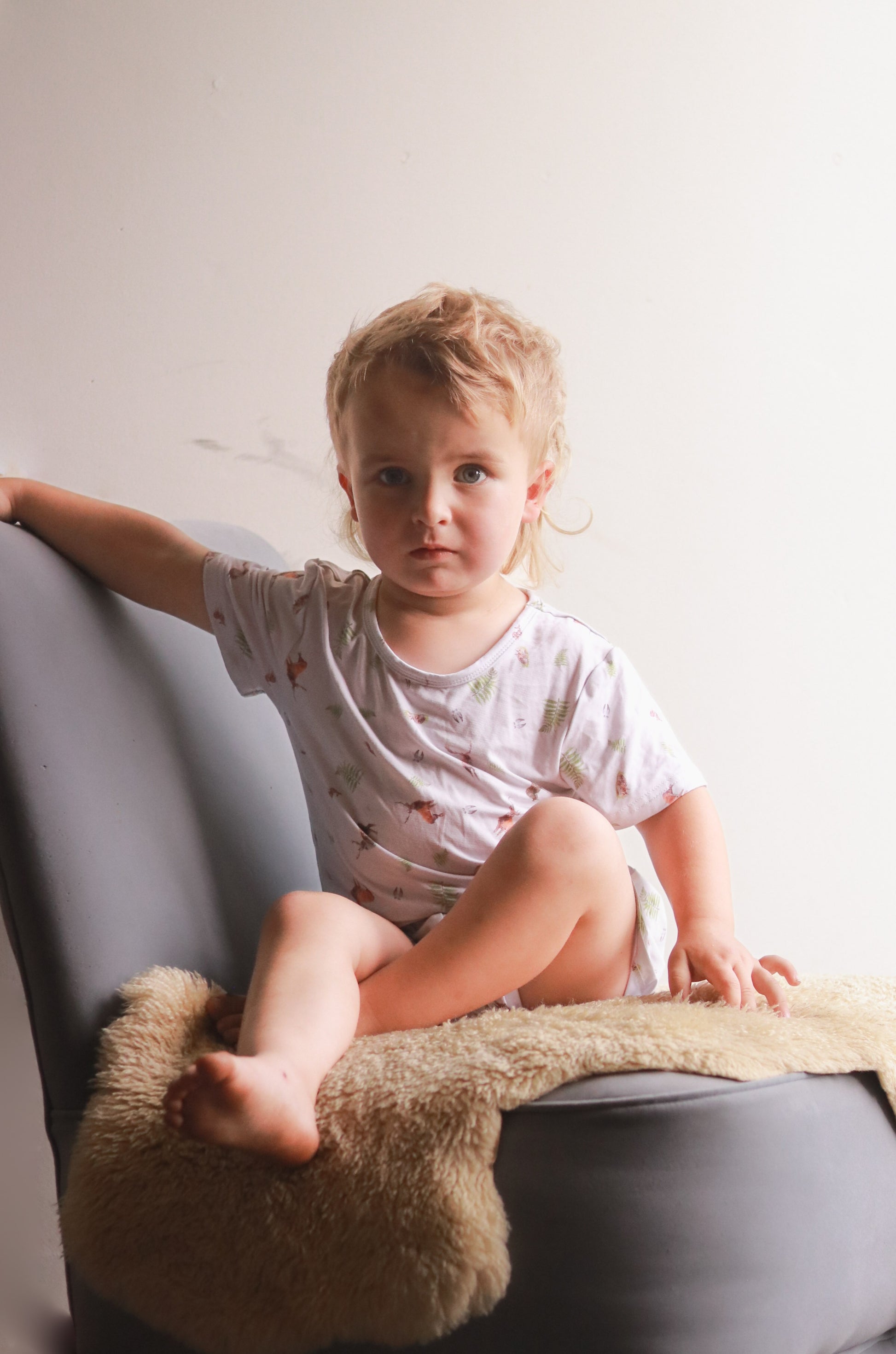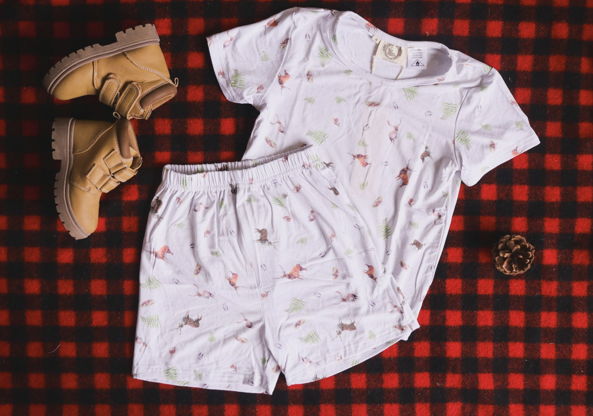 Bamboo Short Sleeve Pajama set featuring the Little Hunters design, with Sika, Fallow and Red Stags along with wee fawns.