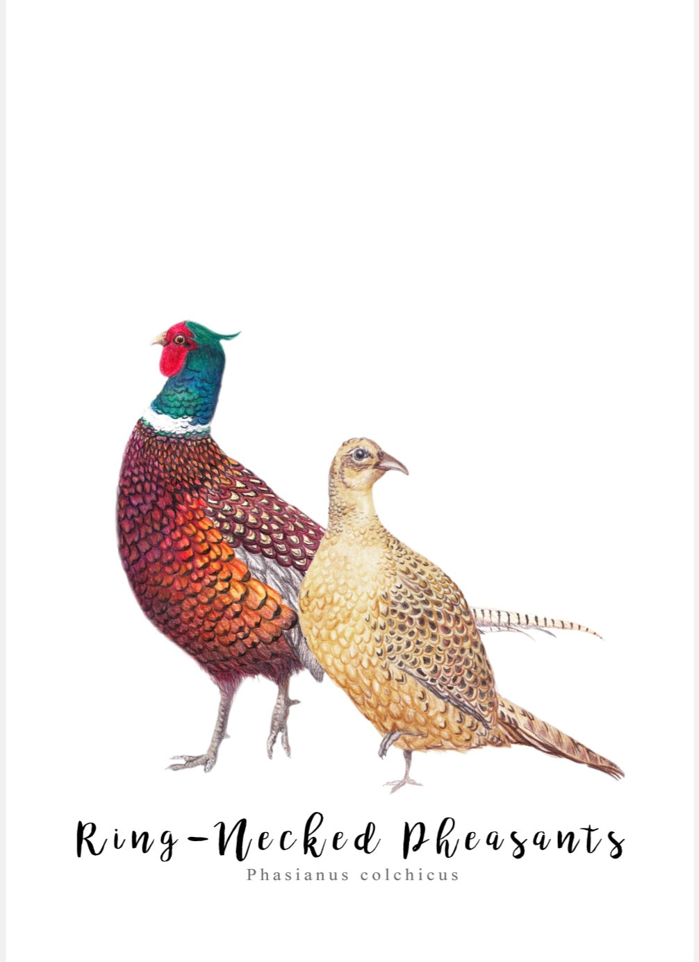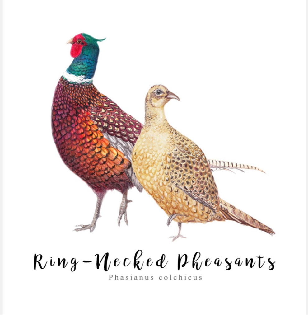Featuring the name and scientific name of the Ring-Necked Pheasant, a popular NZ game bird. This bright and colorful pair make a regal addition to any bird game enthusiasts' kitchen - or wall.