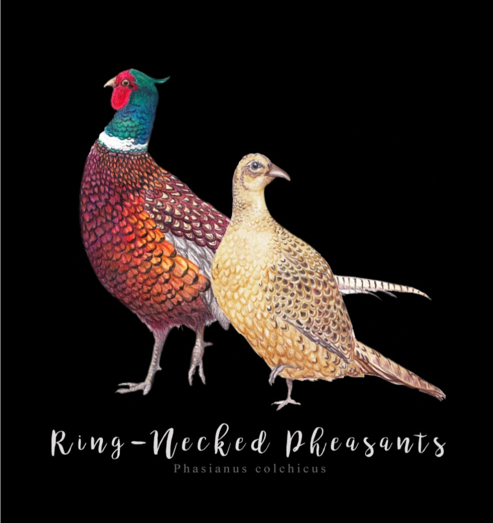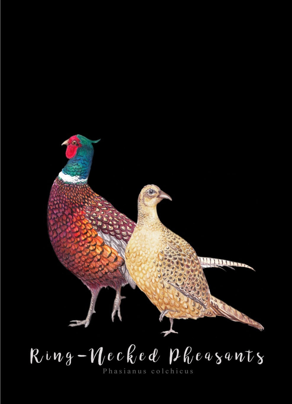 Featuring the name and scientific name of the Ring-Necked Pheasant, a popular NZ game bird. This bright and colourful pair make a regal addition to any bird game enthusiasts kitchen - or wall.