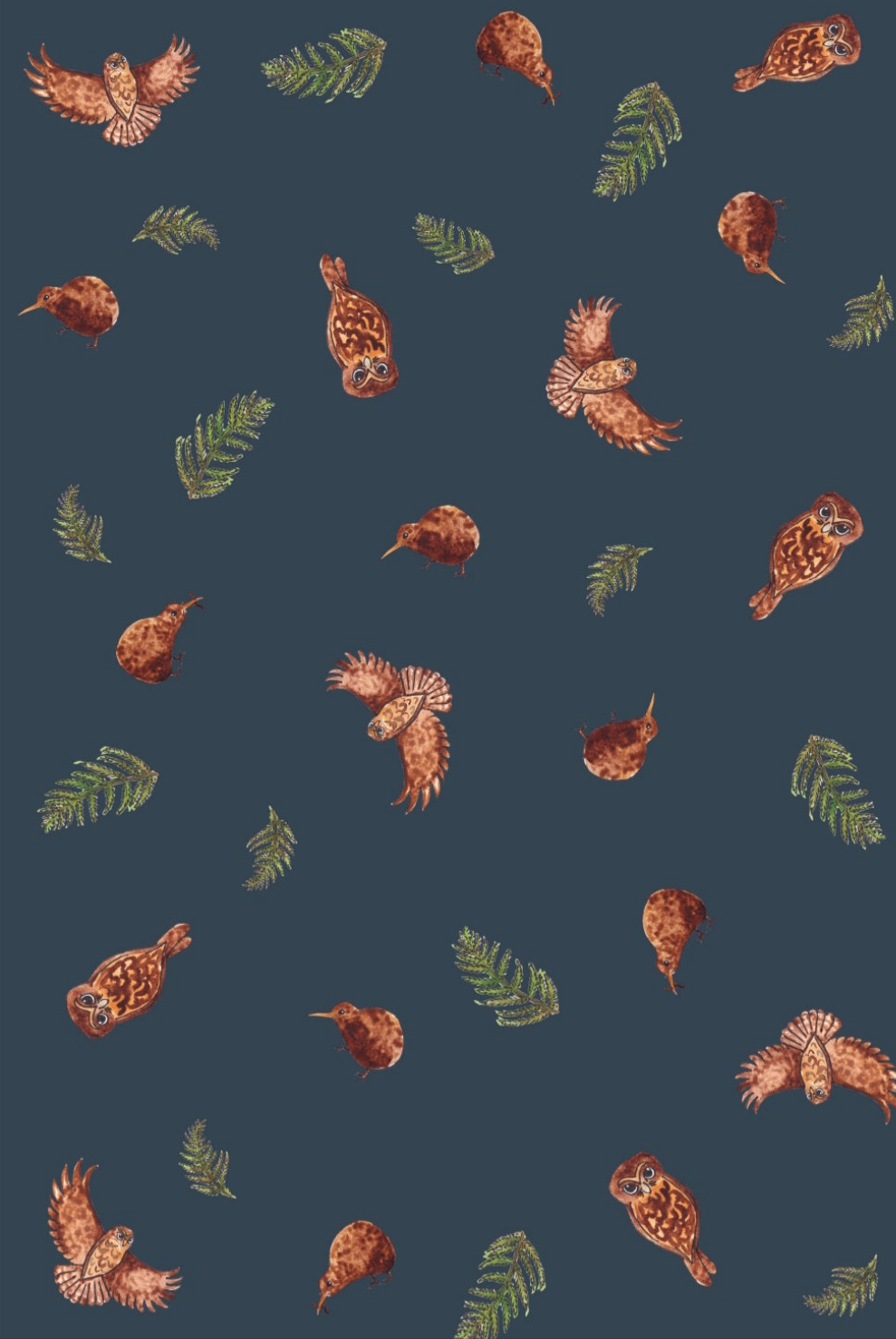 This gorgeous design features watercolour hand painted Moreporks and kiwi amongst bright Ferns on a deep navy blue background.