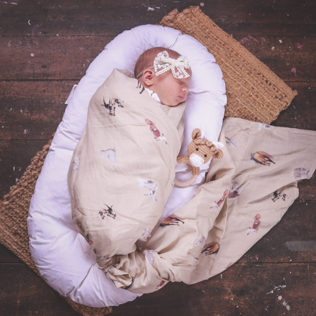 Crafted from a blend of 70% bamboo and 30% cotton muslin, our wraps are designed to be soft, durable, and versatile.