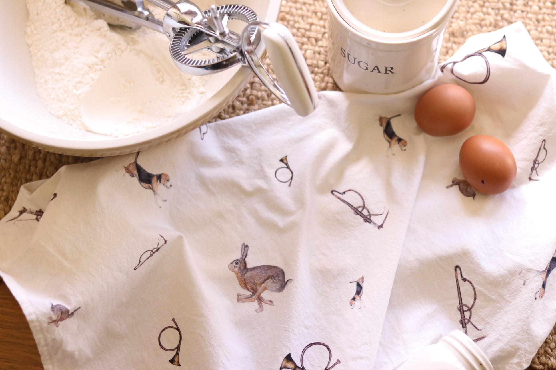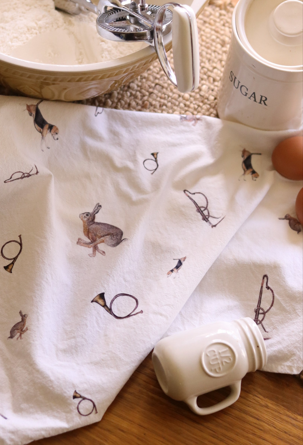 This tea towel features a classic selection of hounds, whips and hare and this one the horn! a regal addition to any kitchen or horse truck.