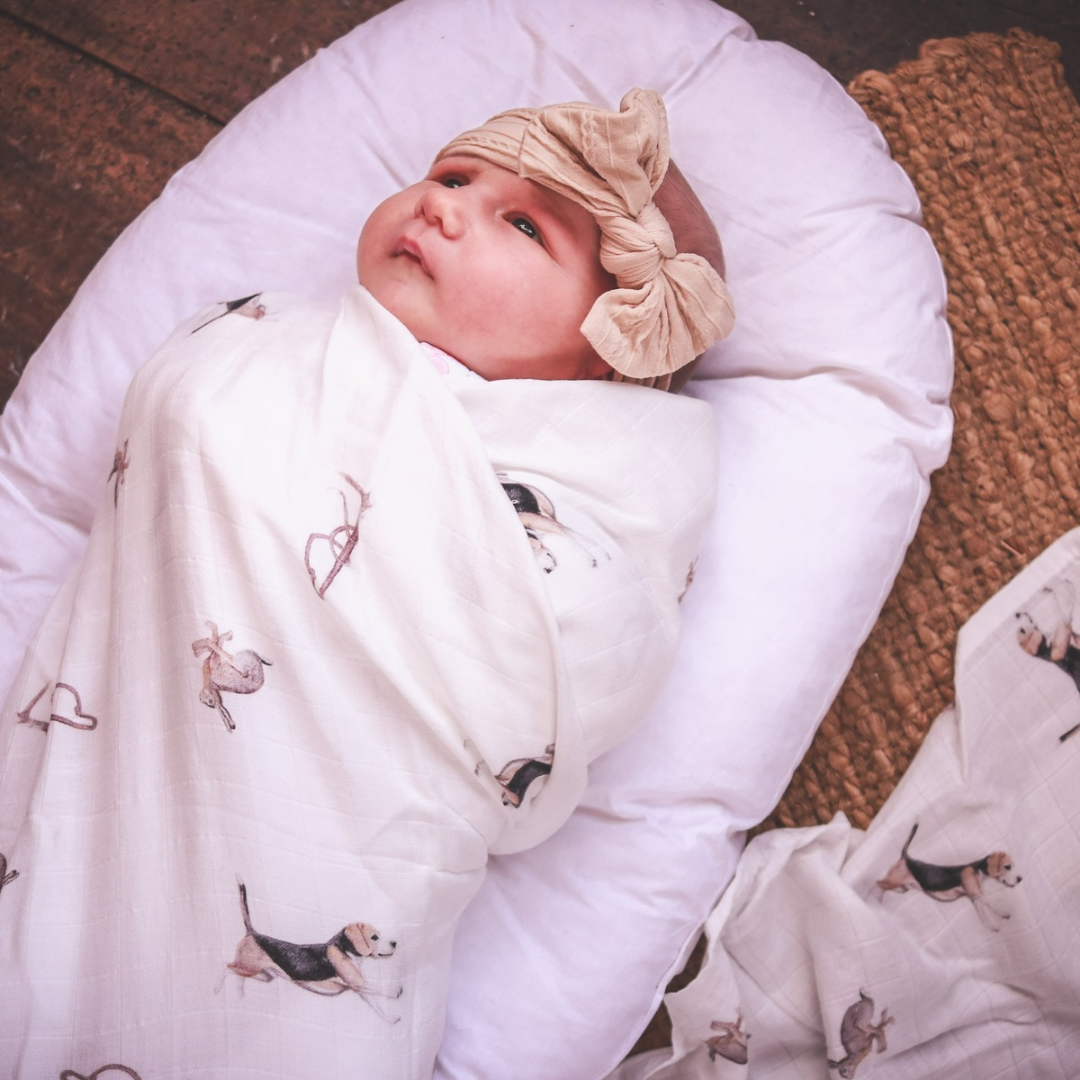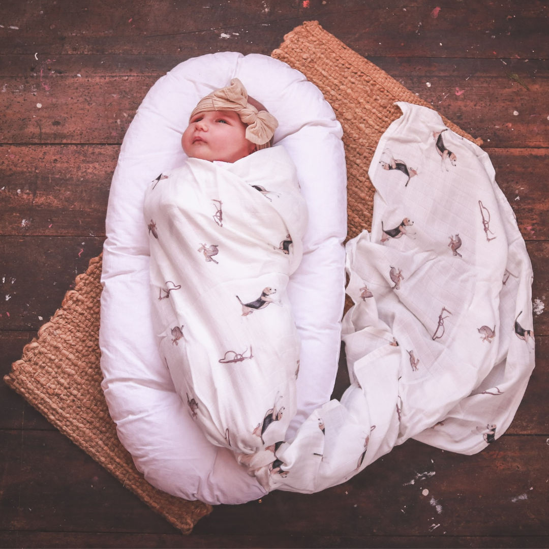 This muslin wrap showcases a hand-drawn print of hounds, hare, and hunting horns on a clean white background. A simple yet striking design, perfect for those who love a touch of country heritage.