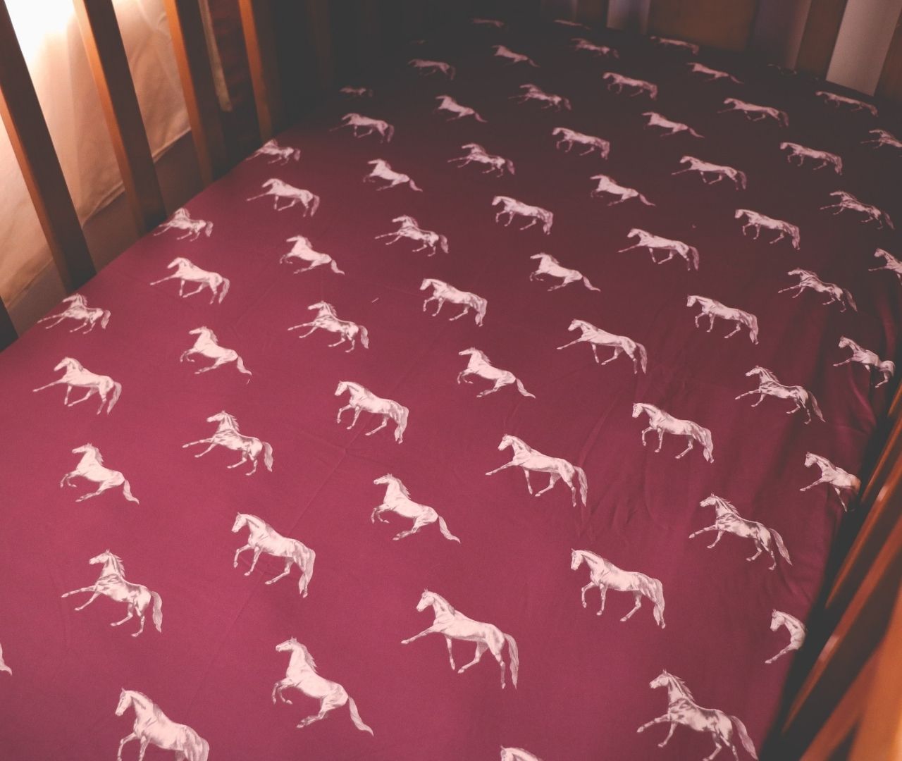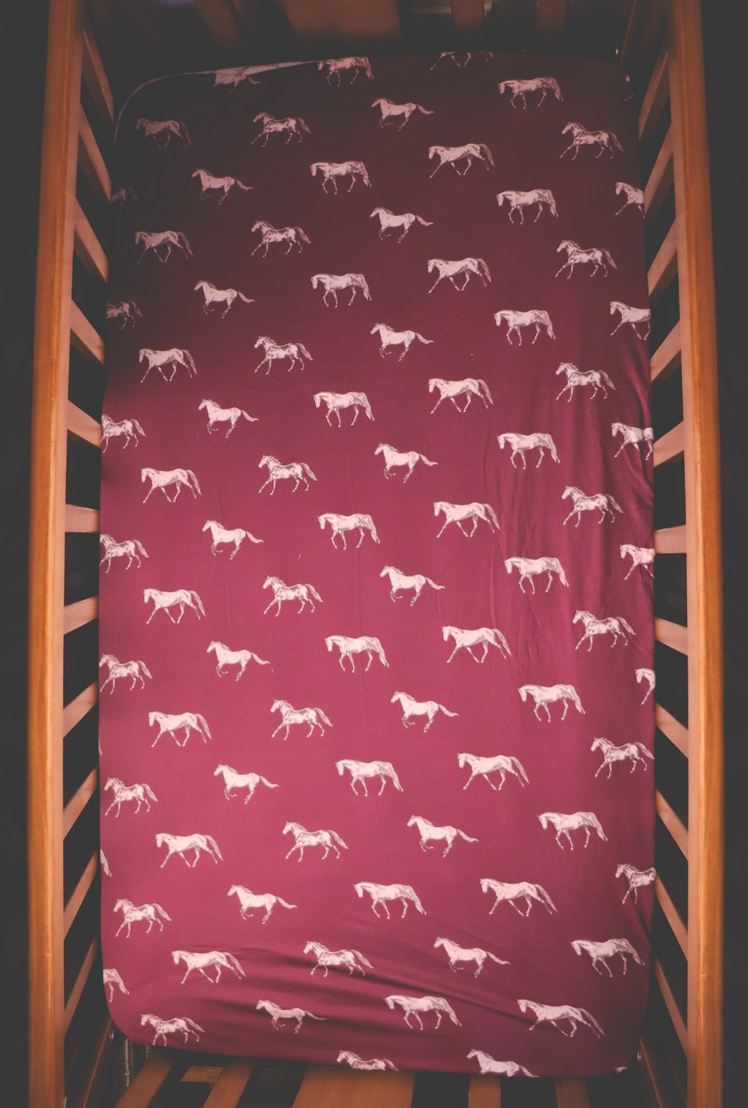 This fitted sheet features the Vintage Horses -a design inspired by illustrations from childhood books on a beautiful deep Fig colour and comes in a matching drawstring bag.