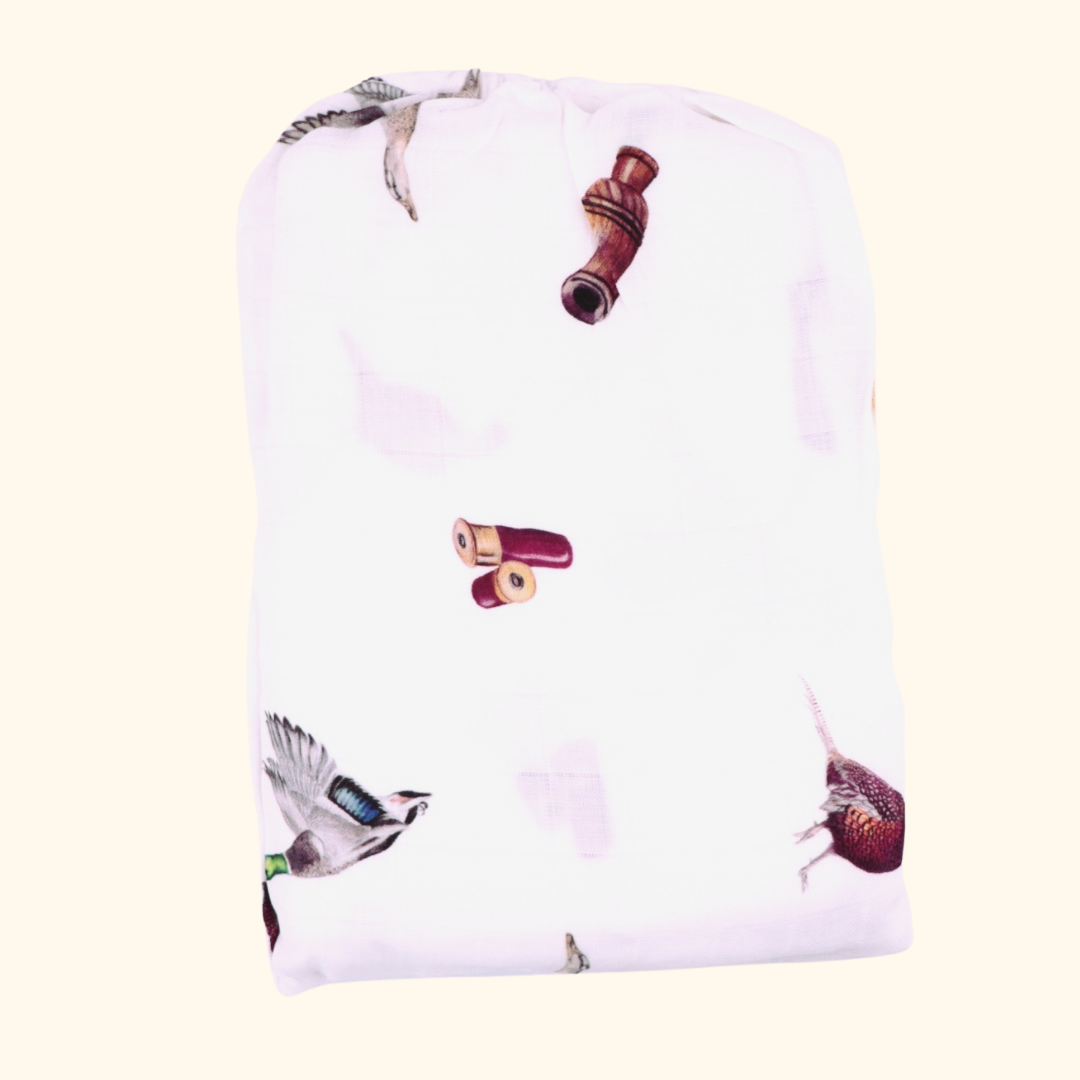This design features fineart hand drawn ducks and all things duckshooting on a White blanket.