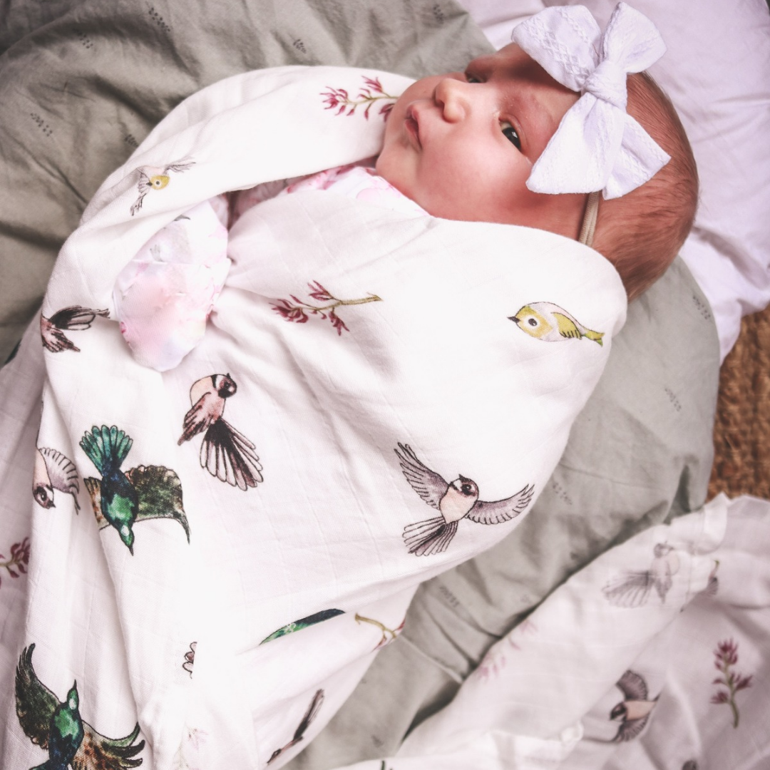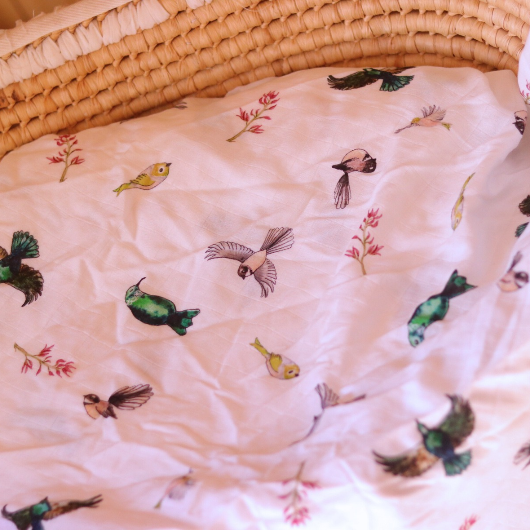 This muslin wrap features a hand-painted watercolour print of Tui, Fantail and Waxeye with Harakeke (Flax) flowers on a classic white base. Gentle and eye-catching, it adds a touch of elegant charm while remaining beautifully soft and practical.