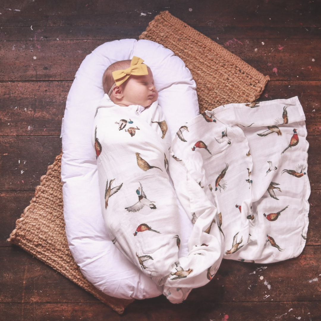 This muslin wrap features a hand-painted watercolour print of Ducks and Pheasants on a classic white base. Gentle and eye-catching, it adds a touch of rustic charm while remaining beautifully soft and practical.